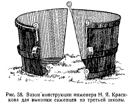 Выкопка саженцев. Производится с сохранением кома и с обнаженными корнями. Первый способ боле трудоемкий и сложный, но он дает почти стопроцентную приживаемость при пересадке саженцев на постоянные места. Для выкопки саженцев с комом применяется специальный вазон (рис. 58), сконструированный инженером Н. Я. Красиковым. Вазон состоит из двух половинок, соединяемых крючьями; дно вазона не сплошное, а с вырезом посередине для облегчения соединения двух половинок, подведенных под ком саженца. Предварительно саженец окапывается кольцевой канавкой так, чтобы ком его соответствовал размеру вазона. Снизу на глубине, соответствующей высоте вазона, ком и корневую систему подрезают в горизонтальной плоскости, после чего обе половинки вазона опускают в канавки и скрепляют крючьями. Саженец с комом земли поднимают из ямки за боковые скобы, под которые подводят два бревна. Подъем и погрузку осуществляют четыре рабочих. После такой выкопки оставшиеся ямки должны засыпаться привозной растительной землей.